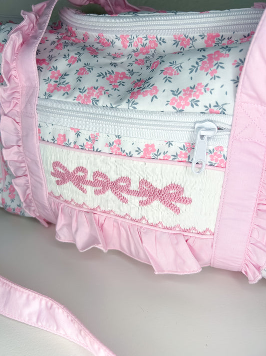Sold outFancy Floral Hand Smocked Bow Duffel