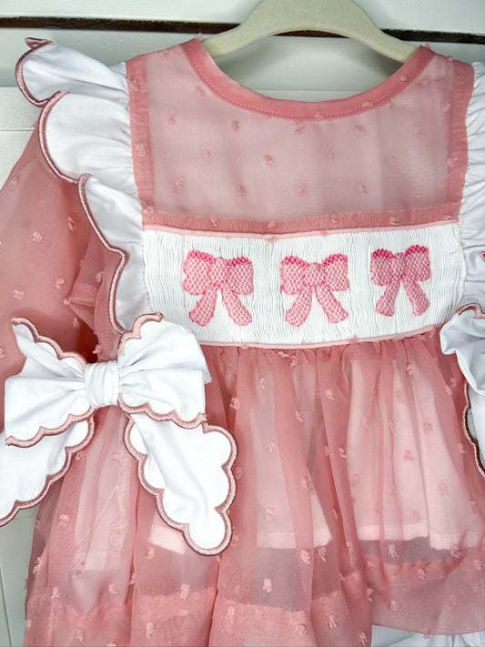 Hand Smocked Pink Bow Swiss Dot Bubble