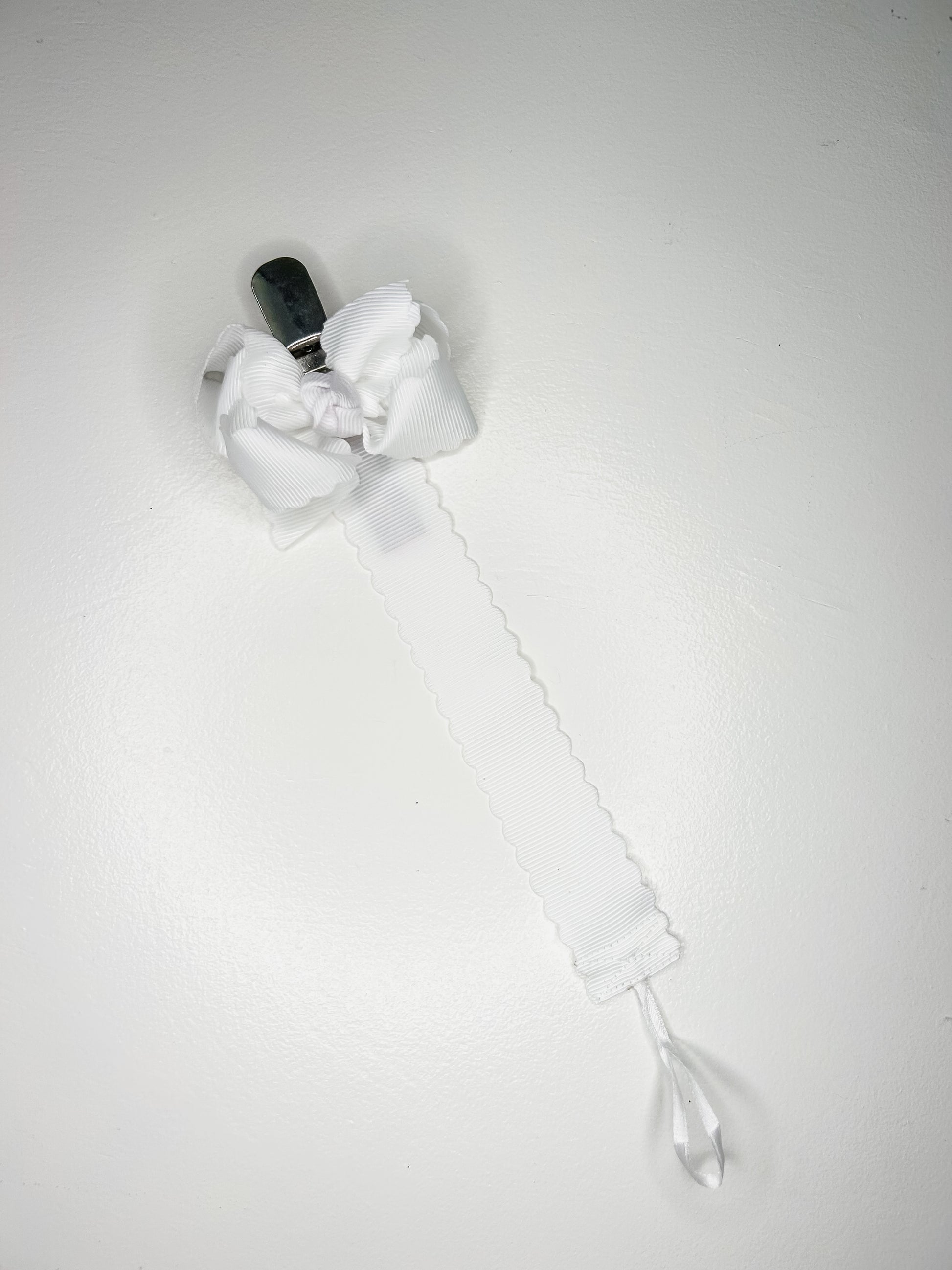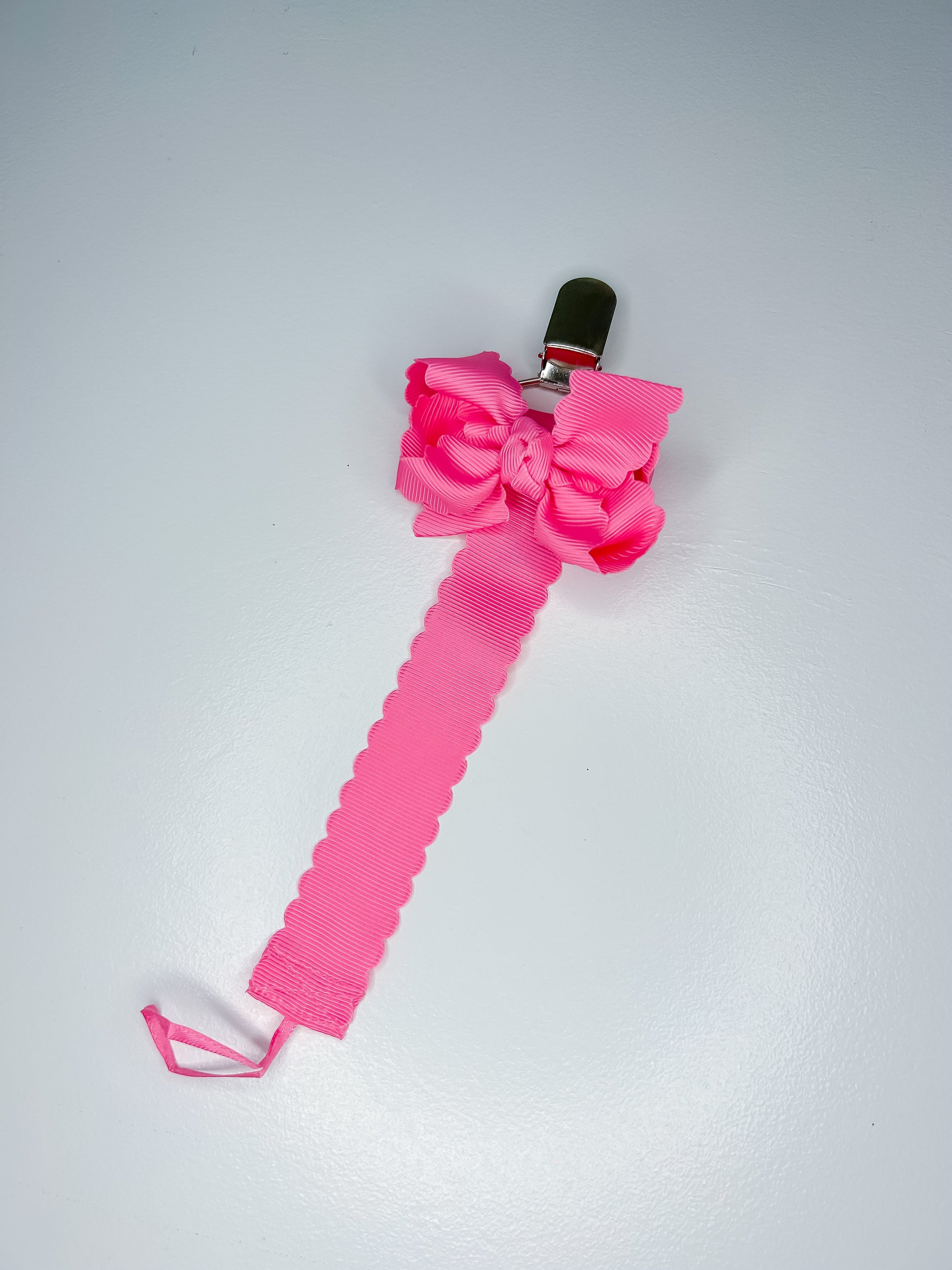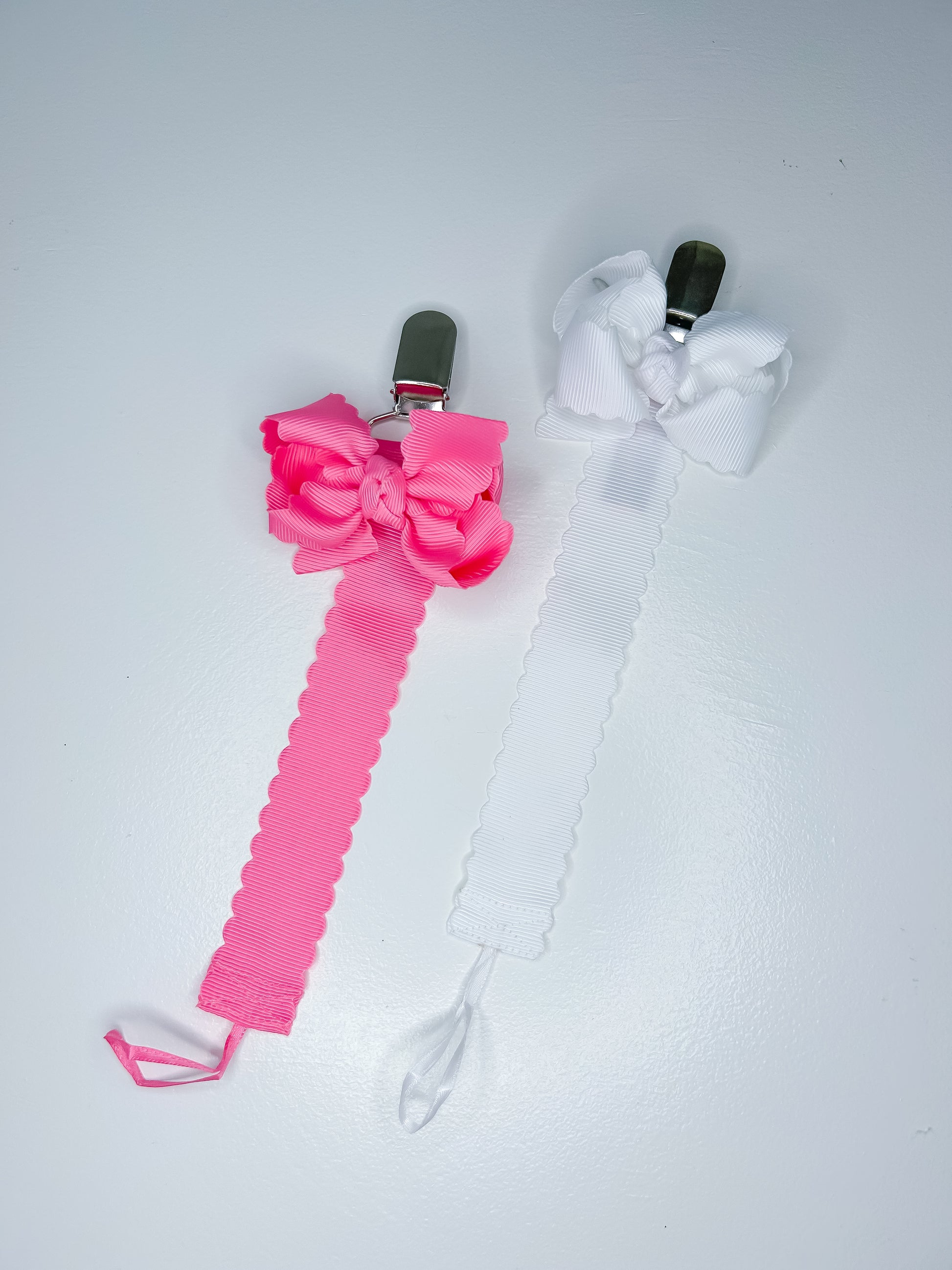 Scalloped Grosgrain Pacifier Clip w/ detachable Bow (Pink & White)